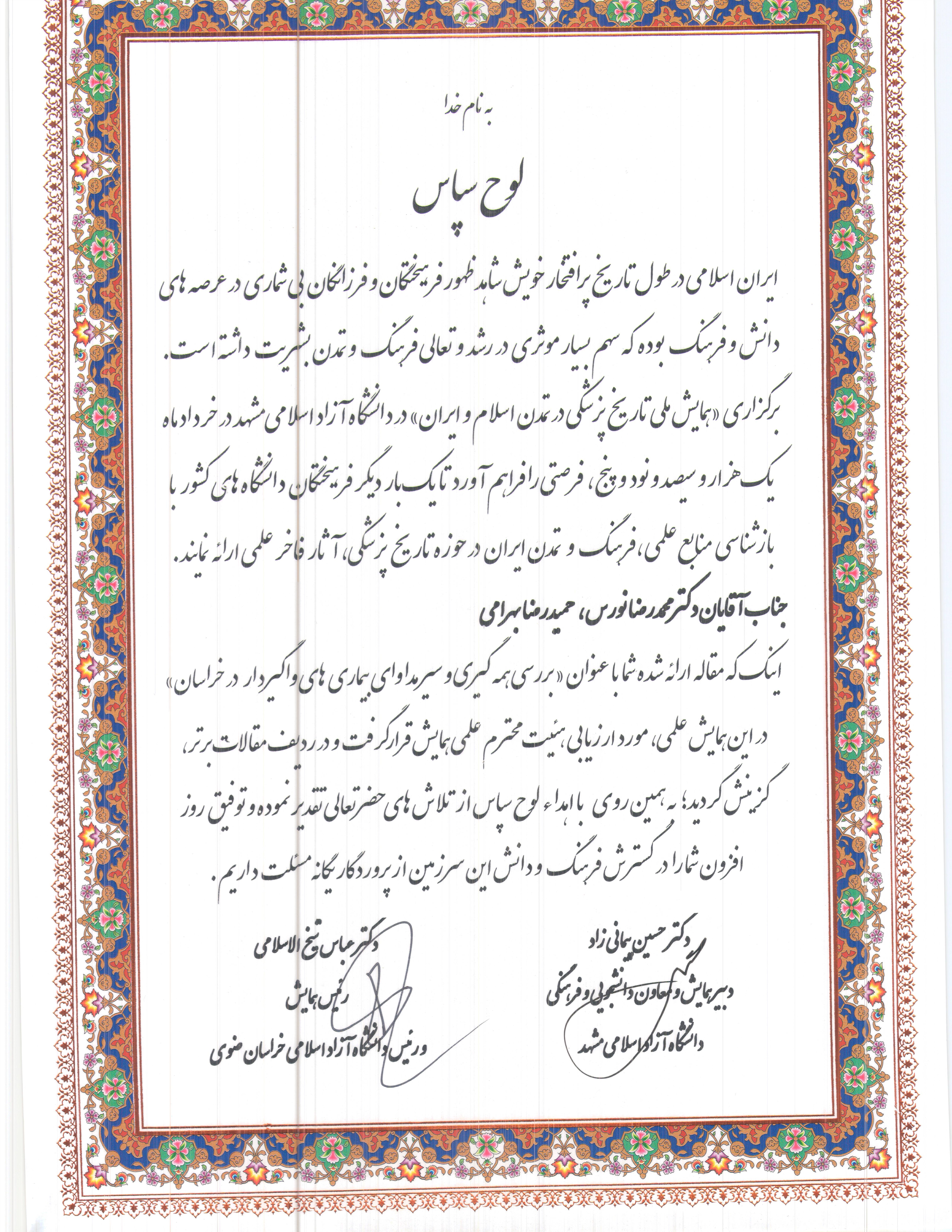 به گزارش روابط عمومی معاونت بهداشت دانشگاه علوم پزشکی مشهد مقاله ارائه شده با عنوان « بررسی همه گیری و سیر مداوای بیماریهای واگیردار در خراسان » که توسط دکتر حمیدرضا بهرامی معاون بهداشت دانشگاه و دکتر حمید رضا نورس دبیر کمیته پژوهش معاونت بهداشت در« همایش ملی تاریخ پزشکی در تمدن اسلام و ایران» که توسط دانشگاه آزاد اسلامی مشهد در خردادماه سال 1395 برگزار گردید به عنوان مقاله برتر شناخته شد و مورد تقدیر قرار گرفت.