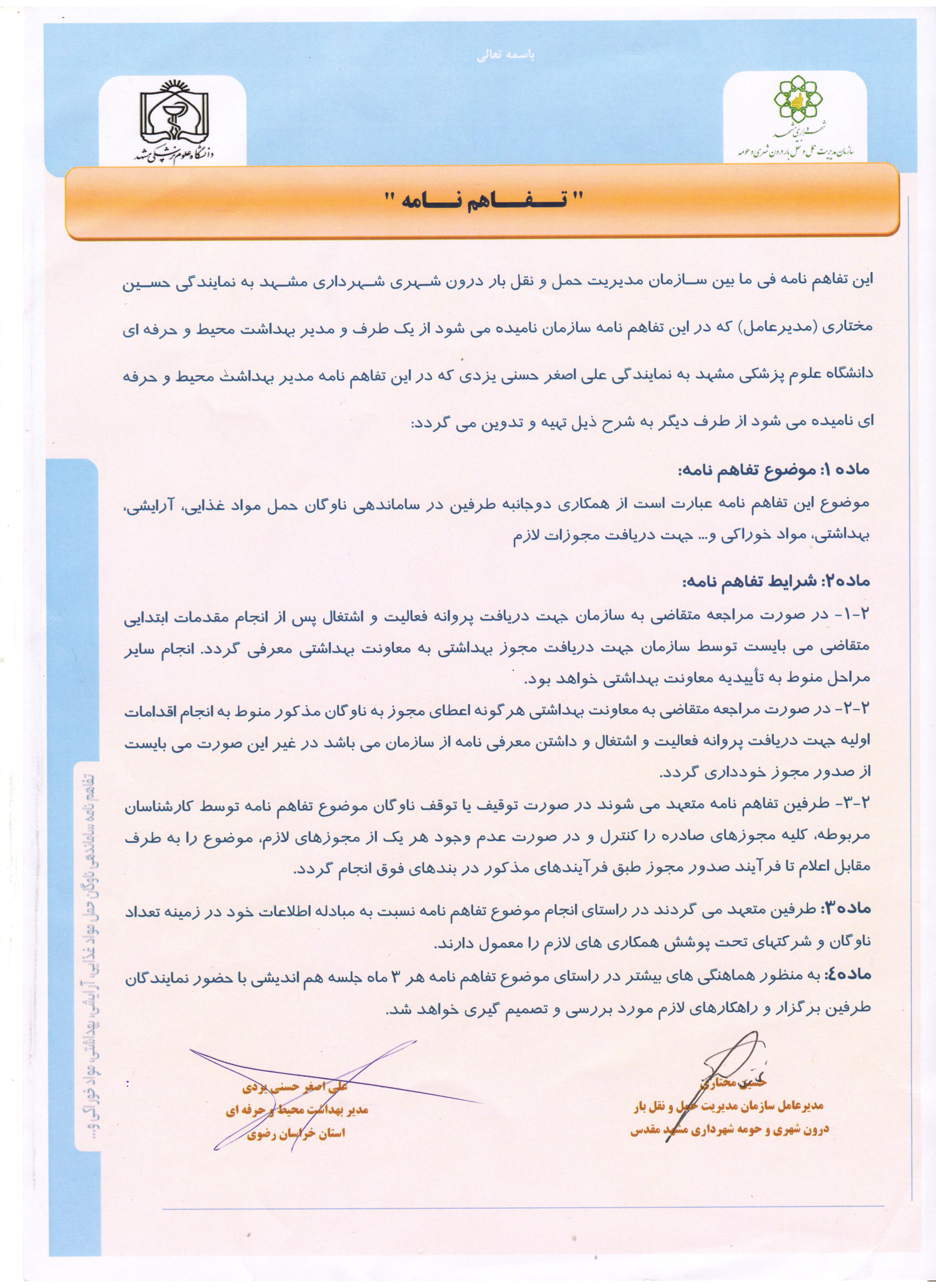 |   به گزارش روابط عمومي معاونت بهداشت دانشگاه علوم پزشکي مشهد در راستای ارتقاي ایمنی حمل مواد غذایی و ایجاد هماهنگی های برون بخشی، تفاهم نامه ای فی مابین سازمان مدیریت حمل و نقل بار درون شهری شهرداری مشهد و مدیریت بهداشت محیط و حرفه ای معاونت بهداشت دانشگاه علوم پزشکی مشهد منعقد گردید. مدیر بهداشت محیط و حرفه ای معاونت بهداشت دانشگاه، هدف از انعقاد این تفاهم نامه را ایجاد هماهنگی در هنگام صدور پروانه بهداشتی حمل خودرو توسط معاونت بهداشت و صدور گواهی اشتغال توسط سازمان مدیریت حمل و نقل عنوان نمود و گفت: مطابق مفاد این تفاهم نامه، خودروهای حامل مواد غذایی که جهت اخذ گواهی اشتغال به سازمان مدیریت حمل و نقل درون شهری شهرداری مراجعه می نمایند، با دارا بودن پروانه بهداشت حمل خودرو و صادره از معاونت بهداشت دانشگاه علوم پزشکي مشهد، گواهی اشتغال را از متقاضی پروانه درخواست می نمایند.مهندس علی اصغر حسنی خاطرنشان کرد: به منظور هماهنگی های بیشتر در راستای موضوع تفاهم نامه هر 3 ماه يکبار جلسه هم اندیشی با حضور نمایندگان طرفین برگزار و راهکارهای لازم مورد بررسی و تصمیم گیری قرار خواهد گرفت. |