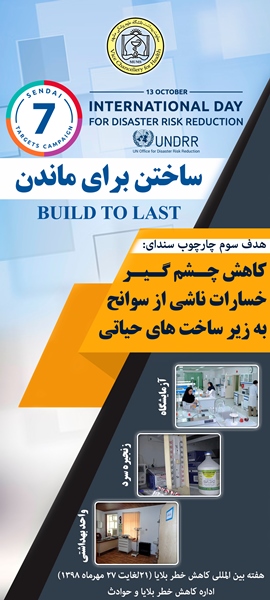 21 لغایت 27 مهرماه مصادف با هفته بین المللی کاهش خطر بلایا با شعار « ساختن برای ماندن BUILD TO LAST» اعلام گردیده است که هدف سوم از اهداف هفتگانه سند سندای (2015-2030) با عنوان كاهش چشم گير خسارات ناشي از سوانح به زير ساخت هاي حياتي می باشد.