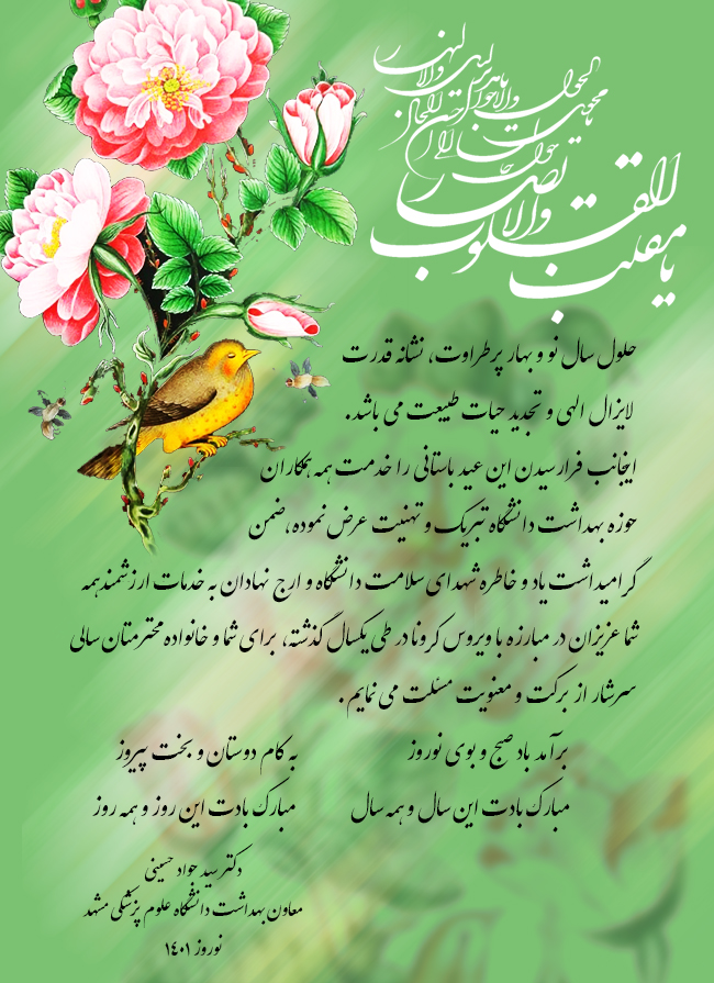 ضمن تبریک فرا رسیدن نوروز باستانی به شما کارکنان حوزه بهداشت دانشگاه و خانواده های معززتان امیدوارم به فضل الهی و با همت والا در نبرد سراسری با ویروس کرونا و ادامه مبارزه همه جانبه با آن و تکمیل واکسیناسیون تمام گروههای هدف با مشارکت سایر بخشهای توسعه و آحاد مردم در بازگشت آرامش به فضای سلامت کشورمان بیش از پیش موفق باشیم.