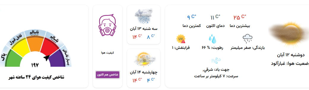 به گزارش روابط عمومی معاونت بهداشت دانشگاه، شهروندان برای دسترسی به اطلاعات شاخص کیفیت هوا در شهر مشهد میتوانند به سایت سامانه پالایش آلایندههای زیست محیطی (https://payesh.mashhad.ir/citizen/) مراجعه نمایند.