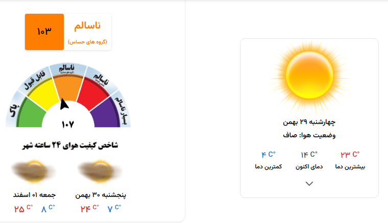 بر اساس اعلام واحد بهداشت هوای معاونت بهداشت دانشگاه علوم پزشکي مشهد، شاخص کیفیت هوا ، هم اکنون عدد 103 را نشان میدهد که بیانگر وضعیت «ناسالم برای تمامی گروهها » است.